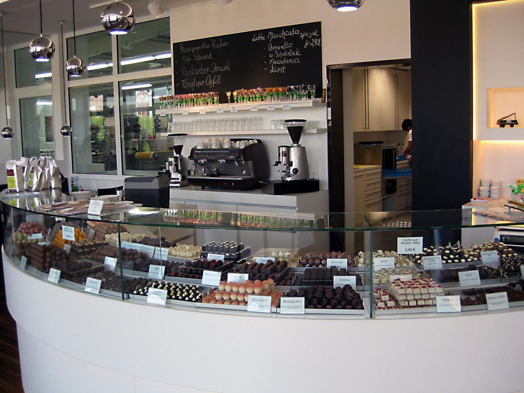 Lassen Sie sich in unserem Café vom Duft der Schokolade und frischen Kaffeespezialitäten verführen. Genießen Sie unsere unwiderstehlichen Trüffel und Pralinen und unsere hauseigene Kaffee-Komposition. Dabei können Sie, nur durch eine Glasscheibe getrennt, unseren Chocolatiers bei der Arbeit über die Schulter schauen.
