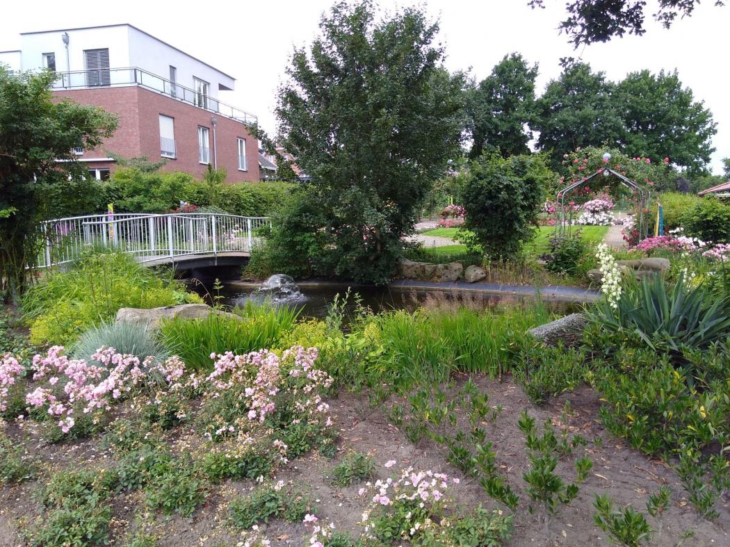 "Das Heimathaus, das mitten im Garten steht, wurde von ehrenamtlichen Mitarbeitern des Vereins 1997 – 98 gebaut. Es wird für Gartengeräte und Maschinen genutzt. Auch öffentliche Toiletten stehen den Besuchern hier jederzeit zur Verfügung. Die Parkanlage ist ganzjährig geöffnet und der Eintritt ist frei. Etwa 2,5 km gepflasterte Wege und 39 Ruhebänke stehen den Besuchern von nah und fern zur Verfügung. Die Frühjahrsblumen ziehen schon einige tausend Besucher an. Von Juni bis Ende August ist die Anlage ein Blütenmeer. Auch ein Teich mit 70 m³ Wasser, Seerosen und über 300 Zierfische ist vorhanden. Führungen von Rosenfachleuten durch den Rosengarten werden angeboten."
