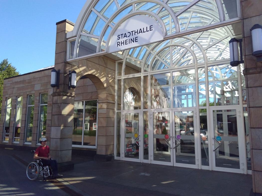 Die Stadthalle Rheine ist barrierefrei. Rollstuhlfahrer können über eine Tastenöffnung die rechte Tür des Haupteingangs problemlos öffnen und in das Gebäude gelangen. Der Zugang zum Saal ist ebenerdig. Nach persönlicher Rücksprache reservieren wir gerne Plätze für Rollstuhlfahrer im Oberrang. Begleitpersonen können in unmittelbarer Nähe des Rollstuhlplatzes sitzen. Im Foyer gibt es einen Aufzug, der ins Untergeschoss fährt. Dort befinden die Toiletten. Zusätzlich gibt es ein behindertengerechtes WC im Obergeschoss.