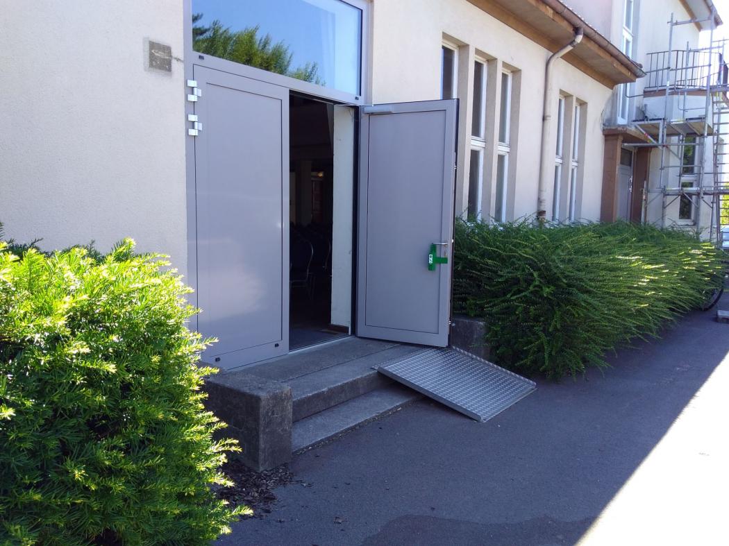Das Gebäude ist über den Nebeneingang über eine Rampe zugänglich.