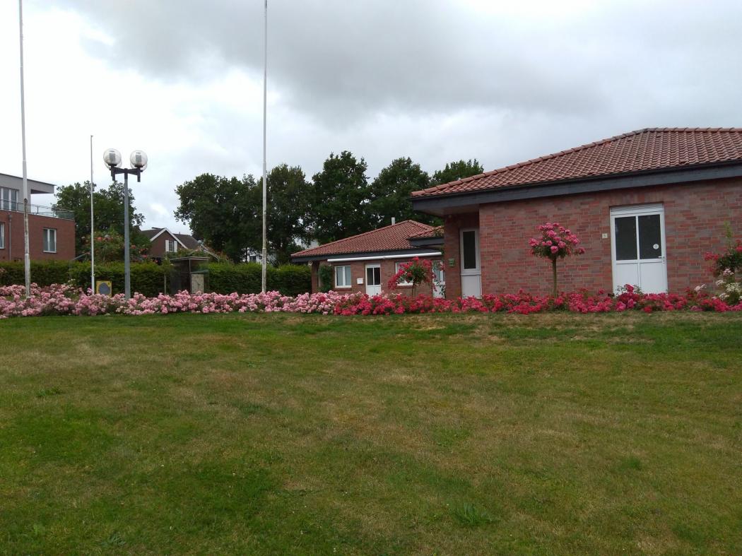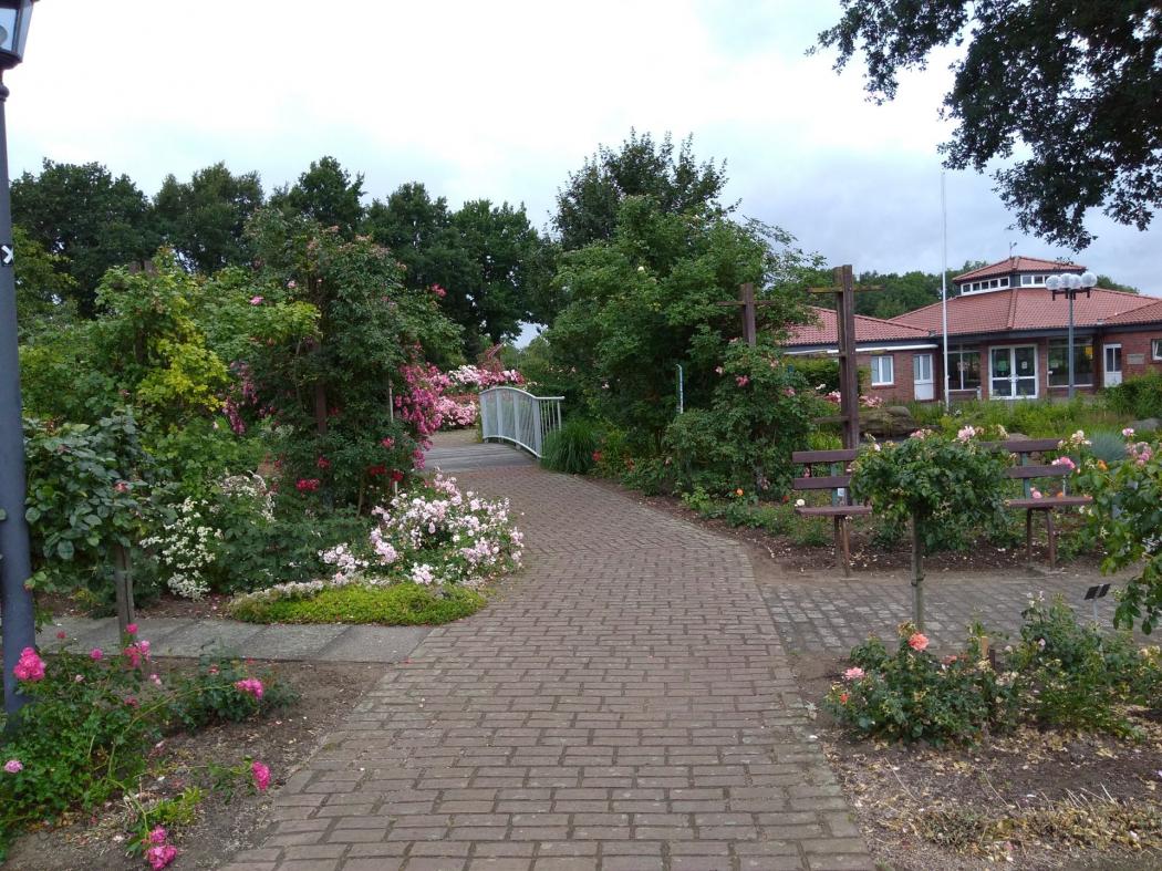 "Das Heimathaus, das mitten im Garten steht, wurde von ehrenamtlichen Mitarbeitern des Vereins 1997 – 98 gebaut. Es wird für Gartengeräte und Maschinen genutzt. Auch öffentliche Toiletten stehen den Besuchern hier jederzeit zur Verfügung. Die Parkanlage ist ganzjährig geöffnet und der Eintritt ist frei. Etwa 2,5 km gepflasterte Wege und 39 Ruhebänke stehen den Besuchern von nah und fern zur Verfügung. Die Frühjahrsblumen ziehen schon einige tausend Besucher an. Von Juni bis Ende August ist die Anlage ein Blütenmeer. Auch ein Teich mit 70 m³ Wasser, Seerosen und über 300 Zierfische ist vorhanden. Führungen von Rosenfachleuten durch den Rosengarten werden angeboten."
